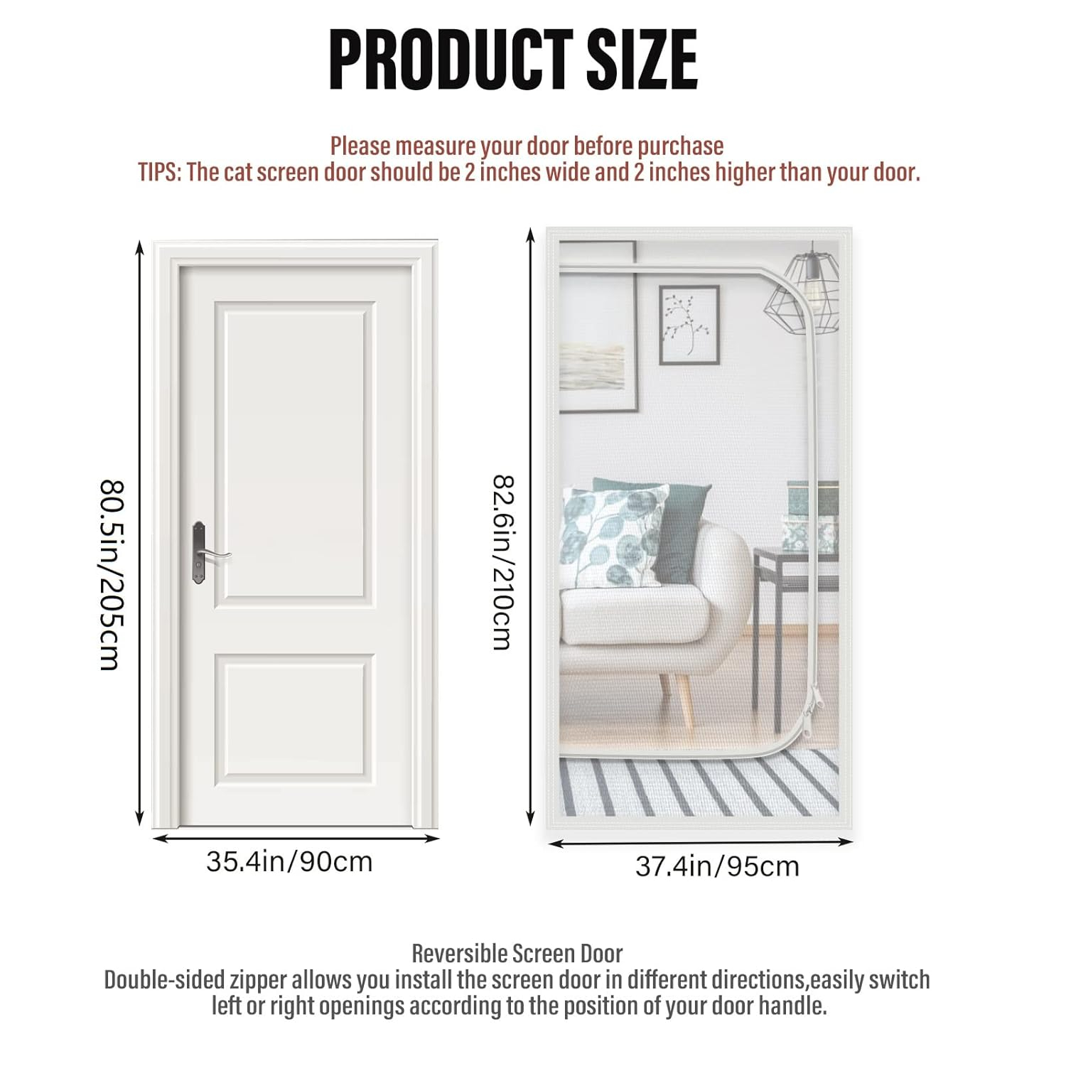 Cat screen door size is about 37.4″ x 82.6″, applicable door size is about 35″-36″ wide, and length is between 80″-81″ (excluding door frame size, please confirm the size in advance before purchasing Suitable).