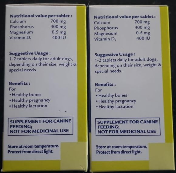 CANITONE TABLETS is a nutritional supplement for pets with excellent palatability. RECOMMENDATION FOR To support optimal bone health in adult pets; to meet the demands during pregnancy and lactation. WHY CHOOSE CANITONE TABLETS? CANITONE TABLETS offers Vital minerals and vitamins to support bone health in adult pets in a palatable tablet form. Nutritional Value Per Tablet Calcium 700mg Phosphorus 400mg Magnesium 0.5mg VitaminD3 400 IU SUGGESTIVE USAGE For adult pets: 1-2 tablets daily PACK SIZE 30 tablets