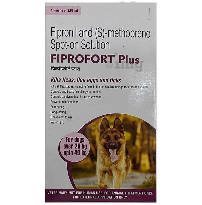 FIPROFORT Plus Spot-On Solution is a powerful and effective treatment for dogs weighing between 20-40 kg. Each 2.68 ml pipette contains Fipronil and (S)-methoprene, providing comprehensive protection against fleas, flea eggs, and ticks for up to one month. This fast-acting formula not only eliminates existing parasites but also prevents reinfestation, making it an essential part of your pet’s healthcare routine. The solution is specifically designed to control and treat flea allergy dermatitis while also managing paralysis ticks for up to 2 weeks. The convenient spot-on application method makes it easy to administer, ensuring your furry friend stays protected with minimal fuss. This veterinary product is strictly for external application on dogs and should never be used on humans or other animals. Each package contains one pipette of 2.68 ml solution, perfect for a single monthly treatment. For optimal results, regular monthly application is recommended as part of your pet’s parasite control programme.