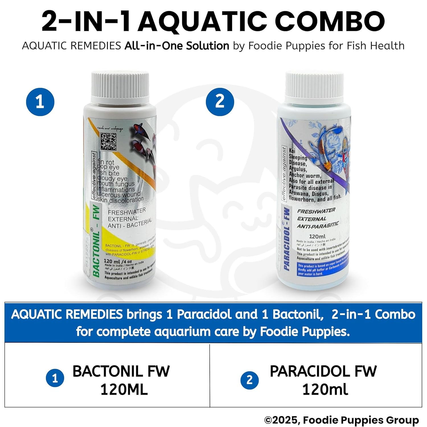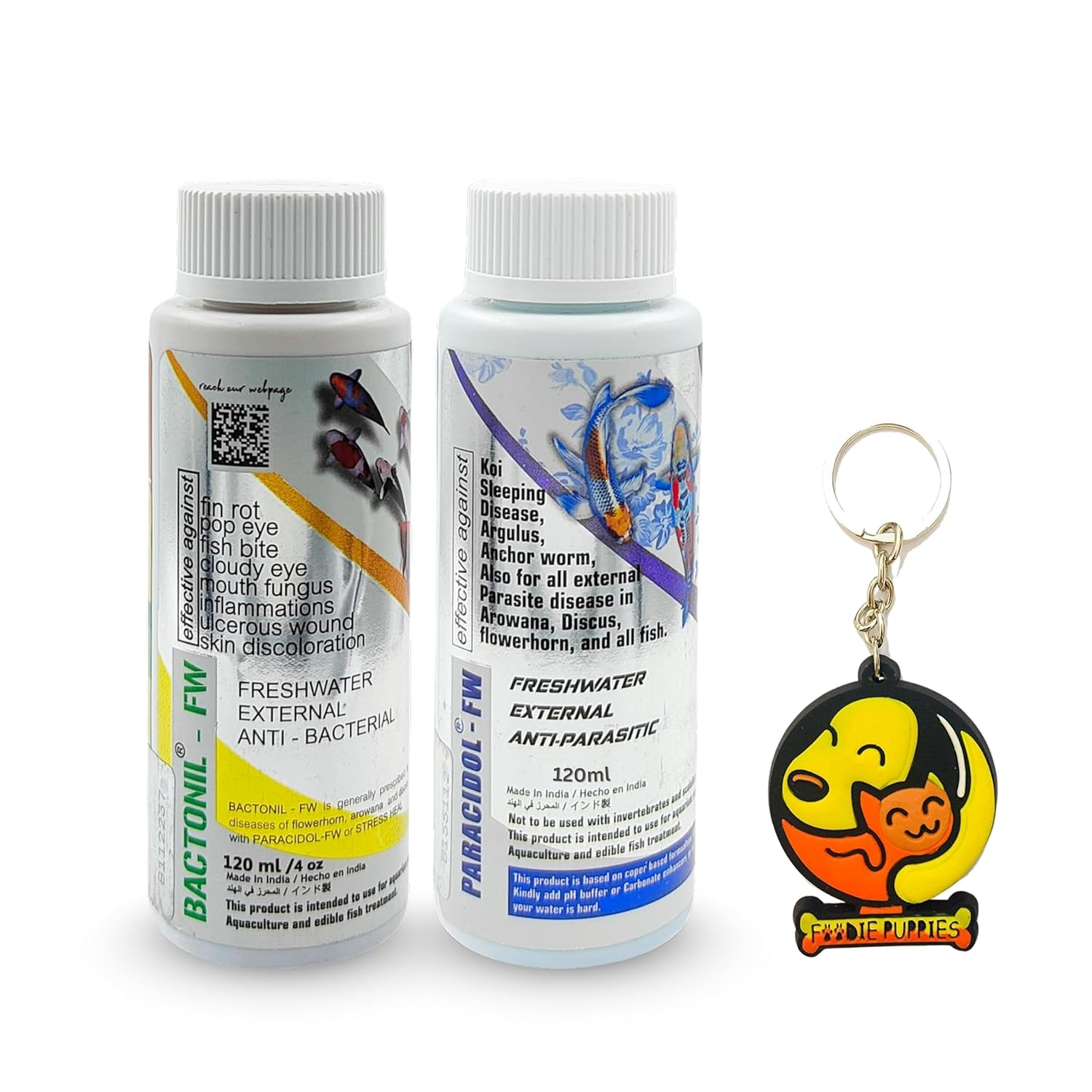 Foodie Puppies Aquatic Remedies 2 in 1 Aquarium Medicine Combo – (Bactonil & Paracidol – 120ml Each) | Anti-Bacterial Effective Fish Skin Treatment |Suitable for Fresh Water with Free Key Ring
