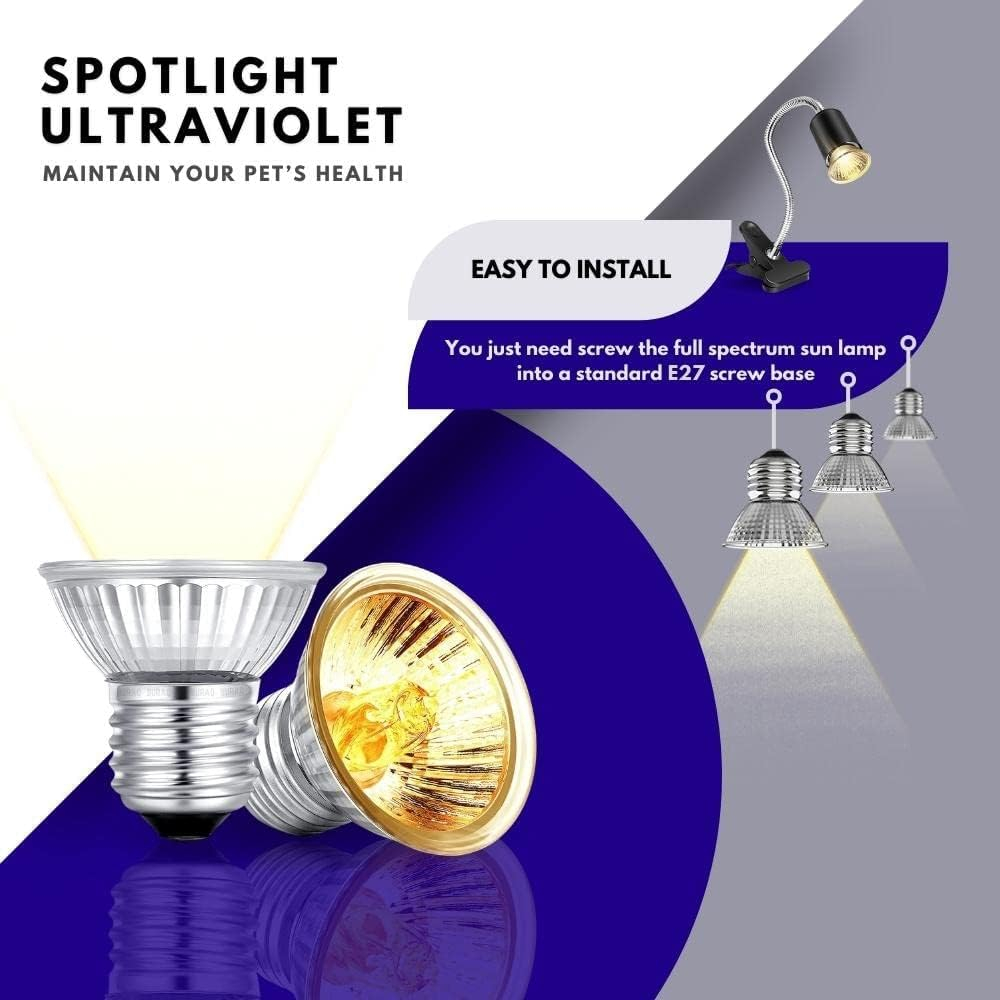 this uvb basking heat light bulb is designed for turtles, tortoises, and other reptiles, providing essential uv light that mimics natural sunlight. it supports vitamin d3 synthesis, promoting healthy bone growth and overall well-being. suitable for aquariums, terrariums, and reptile tanks, this bulb serves as both a heat source and a lighting solution, enhancing the habitat’s ambiance. it is ideal for various reptiles and amphibians, including lizards, iguanas, chameleons, snakes, and frogs. with an average lifespan of 1 to 3 months, it should be used for only 1-2 hours daily to prevent burnout. due to high temperature and electrical fluctuations, keeping extra bulbs for replacement is recommended. this versatile light improves the health and activity levels of reptiles while ensuring a warm and comfortable environment. easy to install, it fits most standard light fixtures, making it a convenient choice for pet owners looking to maintain an optimal habitat.