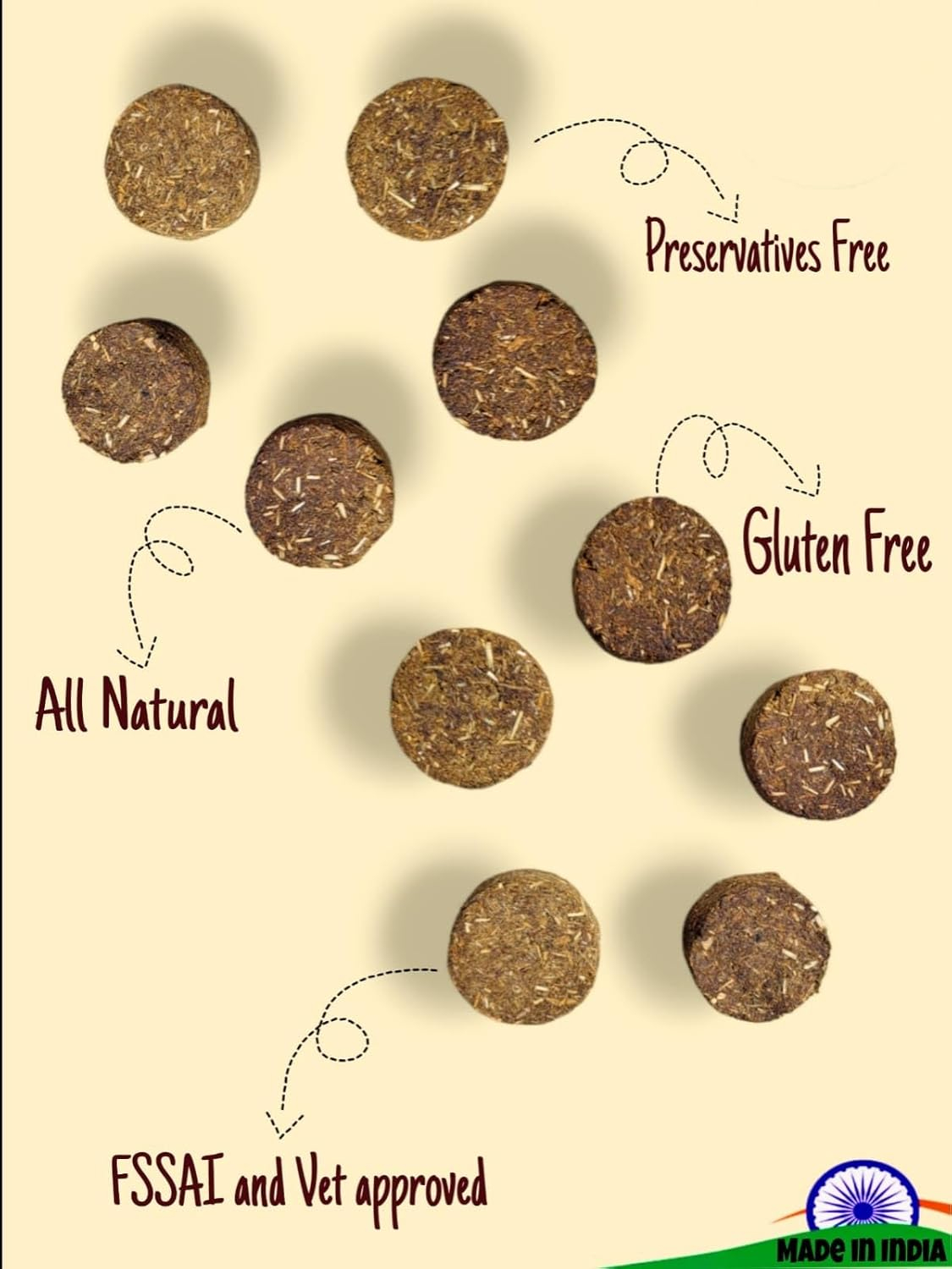 Level up your treat game with our irresistible Hay based cookies with Banana Flavor. Because let’s be honest, our furry friends understand the language of treats best. It’s time to pay them back for kisses & hugs they’ve graciously showered upon you. Each bite is packed with natural sweetness adorned by pets of all sizes and ages. The key ingredient is Hay. Our pure veg Hay based cookies with Banana Flavor treats are crafted with a focus on providing a plant-based alternative while ensuring optimal taste and nutritional value. These treats are free from any animal derived ingredients. We believe in offering a variety of options to cater to different dietary choices and to provide a guilt free treat for your furry friend. Hay, the primary ingredient in these treats packed with essential vitamins and minerals, which supports eye health and overall immune function. They also provide dietary fiber, assisting in healthy digestion. Say farewell to unhealthy, artificial, foul smelling treats and welcome artisanal, hand crafted, natural, and healthy options for your beloved furry companion. Whether you’re looking to reward good behaviour, train your pet, teach them fabulous new tricks or simply show them some love.