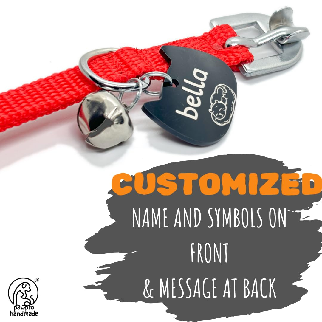 PAWPRO HANDMADE Cat Collar With Name Tag & Bell, Adjustable Buckle, Soft Neck Naylon Strap, Customisable Name & Kitten Icon Id Tag, Comfortable For Small To Big Cats (Red),Nylon,20X10 Cm