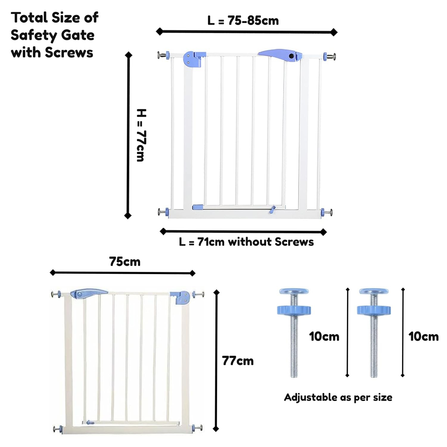 - Adjustable Size: This baby safety gate is adjustable between 75-85 cm, making it the perfect fit for a wide range of doorways and openings.